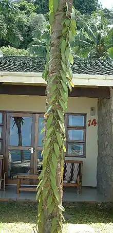 This genus of vine-like plants has a monopodial climbing habitus. They can form long thin stems with a length of more than 35 m, with alternate leaves spread along their length. The short, oblong, dark green leaves of Vanilla are thick and leathery, even fleshy in some species. But there are also a significant number of species that have their leaves reduced to scales or have become nearly or totally leafless and appear to use their green climbing stems for photosynthesis. Long and strong aerial roots grow from each node.