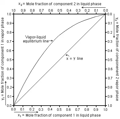 For each component in a binary mixture, one could make a vapor–liquid equilibrium diagram. Such a diagram would graph liquid mole fraction on a horizontal axis and vapor mole fraction on a vertical axis. In such VLE diagrams, liquid mole fractions for components 1 and 2 can be represented as x1 and x2 respectively, and vapor mole fractions of the corresponding components are commonly represented as y1 and y2.[2] Similarly for binary mixtures in these VLE diagrams: