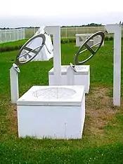 One of the unique features of the city is an outdoor Vedic Observatory consisting of ten six-feet-tall, white, concrete-and-marble astronomical instruments arranged in a circle.[26] According to the Observatory developer, Tim Fitz-Randolph, each instrument is precisely aligned with the sun, moon and stars, and could be used to calculate their actual movements and has the potential to create inner happiness and balance in the physiology.[4][26]