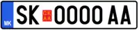 North Macedonia's vehicle registration plates consist of a two-letter region code, followed by a 4-digit numeric and a 2-letter alpha code (e.g. SK 1234 AB). Issuance of the new plates started on 20 February 2012, and they introduced a fourth digit and the blue field on the left side. The standard registration plates dimensions are 520 by 110 millimetres (20.5 in × 4.3 in).[1] The international country code NMK is applied (formerly MK) on the blue field on the left side of the plate. NMK is only used in the car plates, while MK is still used for all other purposes. In February 2019, the country code was changed from MK to NMK, in accordance with the Prespa agreement which changed the country's name to Republic of North Macedonia.[2][3] The new code is a mixture of English (North) and Macedonian (Makedonija).