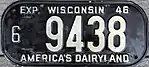 1946–49 | Embossed white serial on black plate; "EXP WISCONSIN 46" at top | "AMERICA'S DAIRYLAND" at bottom | 1 12345 1/0 12345 |