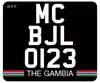 52 cm x 11 cm Black on White Gambian Flag as well as the text GPF on the left side of the license plate |