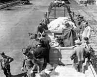 A few weeks prior to the outbreak of the Second World War and the German occupation of Poland, the Poles took the altarpiece apart and stored its main statues in crates dispersed across the country.[1] The crates were located by a Nazi unit called the Sonderkommando Paulsen, plundered and transported to the Third Reich, likely to Berlin. The panels were also found and sent to Germany. They were put in the basement of the Nuremberg Castle.[1] At the castle, Polish prisoners sent messages to members of the Polish resistance that the revered altarpiece was hidden there.[1] The altarpiece survived the war in spite of heavy bombardment of Nuremberg, and was discovered by Count Emeryk Hutten-Czapski, who was attached to the Polish 1st Armoured Division, and it was returned to Poland in 1946,[2] where it underwent major restoration. It was put back at St. Mary's Basilica in 1957.[Note 1][1]