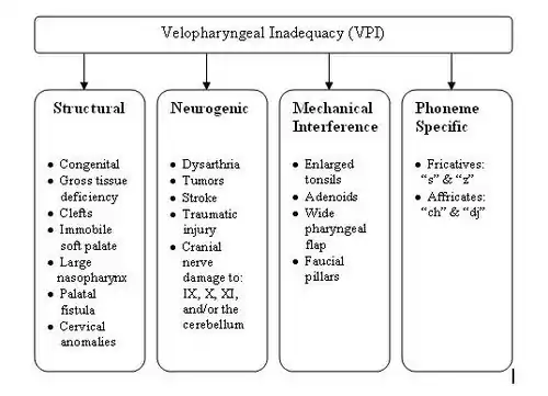 Velopharyngeal insufficiency or incompetency are related labels for this phenomenon, in addition to most common generic- velopharyngeal inadequacy. Velopharyngeal insufficiency is the inability of the velopharyngeal sphincter to sufficiently separate the nasal cavity from the oral cavity during speech. Velopharyngeal incompetency occurs when the soft palate and the lateral/posterior pharyngeal walls fail to separate the oral cavity from the nasal cavity during speech. Although the definitions are similar, the etiologies correlated with each term differ slightly. However, in the field of medical professionals these terms are typically used interchangeably.