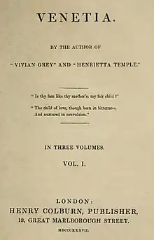 Venetia is a minor novel by Benjamin Disraeli, published in 1837, the year he was first elected to the House of Commons.