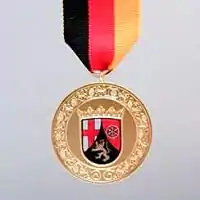 The Verdienstmedaille des Landes Rheinland-Pfalz is a civil order of merit, of the German State of Rhineland-Palatinate, whose Foundation on February 13, 1996 was carried out by Minister-President of Rhineland-Palatinate Kurt Beck. The award of the Medal of Merit is given as a sign of recognition and appreciation of special voluntary contributions to society and their fellow human beings, especially in the areas of corporate, social, cultural, sporty life as well as in environmental and nature conservation.[1]