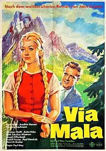 Via Mala is a 1961 West German drama film directed by Paul May and starring Gert Fröbe, Joachim Hansen and Christine Kaufmann.[1] It is an adaptation of the 1934 novel Via Mala by John Knittel, which had previously been made into a film in 1945. After a tyrannical father in a small Swiss village is killed, almost everyone he knows comes under suspicion of having murdered him.