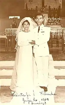Santos married the former Erlinda Solis Tolete on June 22, 1969. Erlinda Santos was a public school teacher, and also a civil servant. They have six children, Vicente III, Benhur, Singapor, Vicerly, Pilipino and Fabian.