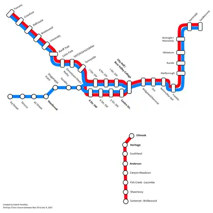 As a result of the construction, there were 2 major CTrain closures. One around Thanksgiving Weekend of 2022 between 39 Avenue S and City Hall stations, and the other being a major 9-day long closure starting on November 24, 2023 between Chinook and City Hall/Bow Valley College stations. Due to the magnitude of the 2023 closures, segments of the remaining C-Train network were rerouted, with the Red Line running on the Northeast Leg of the Blue Line, and the Blue Line running on the Northwest Leg of the Red Line.[5] The train routes during the closure were: