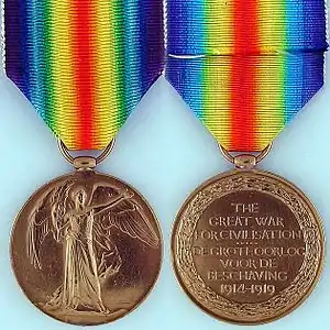 The Victory Medal, also known as the Inter-Allied Victory Medal, was instituted to celebrate the Allied victory in the Great War, in accordance with a recommendation of an inter-allied committee in March 1919.[2] The award of a similar medal to their own veterans by each allied country was intended to prevent a mass exchange of campaign medals.[3]