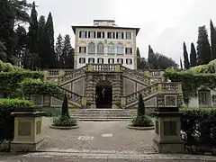 For a short period it was owned by the Italian tenor Giovanni Matteo Mario and his wife Giulia Grisi, the transaction was completed by financier N M Rothschild of London, then in 1871 the villa was purchased by Pietro Pagliano, who added a medievalizing crenellated tower, but a new, more sympathetic owner, the American Phelps Thomas, took ownership in 1882 and began a programme of free restoration and aggrandisement, to designs of the antiquarian architect Corinto Corinti (1843–1930).[3] A large central staircase was added and grand cinquecento portals. He reduced the tower, designed a new vaulted porte-cochere for carriages, overhung by a garden, which still exist, and remodelled the park by adding an Italian terraced garden and conservatories, with a pergola that Penelope Hobhouse found to resemble the wooden frames shown in woodcuts for Francesco Colonna's Hypnerotomachia Poliphili.[4] Augusto Bruschi was entrusted with decorative painting, covering walls with medieval and neo-cinquecento patterns.[1] After a sale of its contents in 1891[5] the villa passed into the hands of the Carrega di Lucedio family and then, in 1911,[6] to the art critic, journalist and founder of the art magazine Il Dedalo, Ugo Ojetti and his wife Fernanda,[7] who undertook further structural remodeling, removing many of the 19th century accretions, and installing an extensive library and many paintings and sculptures.[8] From 1973 to 1987 the Villa Il Salviatino housed Stanford University's overseas program Stanford in Italy with classrooms, offices, library, dining facilities, and students' rooms.[9]
