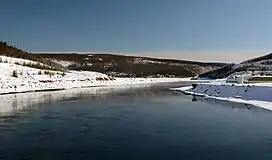 The Vilyuy Plateau is located both north and south of the Arctic Circle in northeastern Krasnoyarsk Krai and western Sakha Republic. To the southwest it borders Irkutsk Oblast.[3] To the north rises the Anabar Plateau, to the west the Syverma Plateau and to the northwest the Putorana Mountains. To the east the plateau descends gradually towards the broad Lena River valley and to the southeast it runs into the Central Yakutian Lowland, which leads to the Lena Plateau on the southern side. The average height of the Vilyuy Plateau surface is around 700 meters (2,300 ft) and the highest point is a 962 metres (3,156 ft) high unnamed summit.[4]