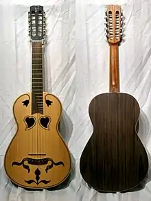 The viola amarantina is a stringed musical instrument from Amarante, Northern Portugal. It is also named viola de dois corações (two-hearted guitar) because of the two heart-shaped frontal openings. It has 10 strings in 5 courses. The strings are made of steel. It is tuned A3 A3, F# F#, B2 B3, G2 G3, D2 D3.[1][2][3]