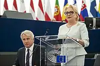 Vasilica Viorica Dăncilă (Romanian pronunciation: [vasiˈlika vi.oˈrika dənˈtʃilə]; born 16 December 1963)[1] is a Romanian politician, former leader of the Social Democratic Party (PSD), and was Prime Minister of Romania from 29 January 2018 to 4 November 2019.[2] She is the first woman in Romanian history to hold both the office of Prime Minister and that of president of the PSD. In 2014, she was elected to a second term as a Member of the European Parliament (MEP), representing the PSD. She was also president of the Social Democratic Women's Organization (OFSD) between 2015 and 2018.