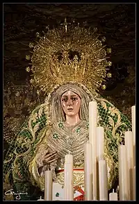 The Virgin of Hope of Macarena (Spanish: Virgen de la Esperanza Macarena[1]), popularly known as the Virgin of Macarena or simply La Macarena, is a Roman Catholic title of the Blessed Virgin Mary associated with a pious 17th century wooden image of the Blessed Virgin venerated in the Basilica de la Macarena in Seville, Spain. The Marian title falls under a category of Our Lady of Sorrows commemorating the desolate grievance and piety of the Virgin Mary during Holy Week. The image is widely considered as a national treasure by the Spanish people, primarily because of its religious grandeur during Lenten celebrations.
