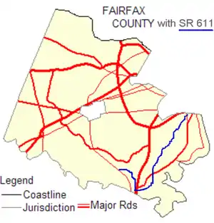 State Route 611 in Fairfax County, Virginia is a secondary state highway which traverses the eastern portion of the county. SR 611 provides a major artery for commuters, connecting the Eisenhower Valley section of Alexandria with Lorton and points south along US 1. SR 611 is known by three names: Telegraph Road, Old Colchester Road, and Furnace Road.