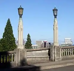 ![]() Detail of light standards and benches mid-span, and view of downtown and east Portland | |