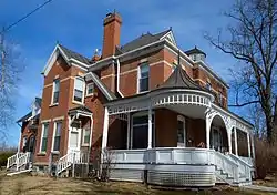 The Vogt House, also known as the Vogt-Unash House and the Kurt Vonnegut House, is a historic building located in Iowa City, Iowa, United States. The two-story, brick structure is a fine example of vernacular Queen Anne architecture.[2] It follows an asymmetrical plan and features a high-pitched hipped roof, a gabled and a round dormer on the south elevation, a two-story gabled-roof pavilion on the east, a two-story polygonal bay with a hipped roof on the west, and a single-story addition on the back. Of particular merit is the wrap-around, latticework porch that has a round pavilion with a conical roof and finial on its southwest corner.[2] There are also two outbuildings: a two-story frame carriage house to the west of the house, and a woodshed to the north of the main house.