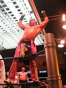 On August 14, 2001, Volador Jr. competed in the annual Torneo Gran Alternativa teaming with Atlantis. The team was eliminated in the semifinals by Black Warrior and Sangre Azteca after having defeated Máscara Año 2000 and Enemigo Publico in the first round.[4] Volador Jr. participated in a tournament to determine the first ever CMLL World Super Lightweight Champion, but was defeated in the first round to Rocky Romero. On December 5, 2003, he, El Felino and Safari won the vacant Mexican National Trios Championship by defeating the team of Alan Stone, Super Crazy and Zumbido in a tournament final.[5] On August 20, 2004, he competed in the Torneo Gran Alternativa once again teaming with Atlantis and once again but they were eliminated in the semifinals, defeated by eventual tournament winners El Hijo del Santo and Místico. In the first round the team had defeated Perro Aguayo, Jr. and Sangre Azteca.[6] Volador Jr., El Felino and Safari lost the Mexican National Trios Championship on March 25, 2005, to Pandilla Guerrera (Doctor X, Nitro and Sangre Azteca).[5] On June 2, 2006, he competed in the Torneo Gran Alternativa, teaming with Dos Caras, Jr. but were eliminated in the first by Último Guerrero and Nitro. On August 13, 2007, Volador teamed up with El Sagrado and La Sombra to win the Mexican National Trios Championship for the second time.[7]