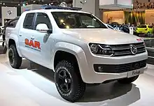 The Volkswagen Amarok is a pickup truck produced by Volkswagen Commercial Vehicles since 2010. It is a body-on-frame truck with double-wishbone suspension at the front and leaf springs at the rear.[1] The Amarok range consists of single cab and double cab, combined with either rear-wheel drive or 4motion four-wheel-drive, and is powered by turbocharged petrol or turbocharged direct injection (TDI) diesel engines.