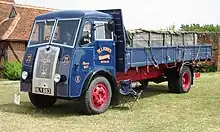 Brockhouse Engineering took over Vulcan in the mid-thirties and managed to keep production going until 1938, when the remains of the company was sold to Tilling-Stevens, a bus manufacturer of Maidstone, Kent.[1] Vulcan (petrol) or Gardner (diesel) engined trucks re-entered production, alongside a new five ton, Perkins-engined lorry. Six ton Vulcans were produced in large numbers during World War II, also with electric power.[1] After the war, six tonners and heavier articulated trucks were built in large numbers, around 1000 per year, and a new seven tonner appeared at that 1950's Commercial Motor Show in London. A few buses & coaches were built on Vulcan chassis one CCF777 a 6PF chassis was built with a Dutfield C29F body for Goldsmith Coaches of Sicklesmere in 1950. The range was successful enough that Tilling-Stevens ended up being taken over by the Rootes Group in 1951.[1] Rootes, however, had their own established commercial makers in Commer and Karrier and as those brands introduced their own heavier trucks both Vulcan and Tilling-Stevens were squeezed out. The two brands vanished finally in 1953.[1]