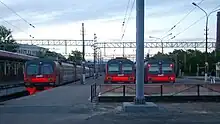 A number of railways pass through the district. The main line between St. Petersburg and Helsinki, the Riihimäki – Saint Petersburg Railway, runs through Vyborg. Another line connecting St. Petersburg and Vyborg follows the coastline of the Gulf of Finland, passing Primorsk. Vyborg is connected to Khiytola via Kamennogorsk. This is the old Vyborg–Joensuu railroad. In Kamennogorsk, a railway branches up north to Svetogorsk; its stretch beyond Svetogorsk to the state border is disused. All these railways are served by suburban trains originating from the Finland Station of St. Petersburg and from Vyborg. In addition, there are daily connections between St. Petersburg and Helsinki.