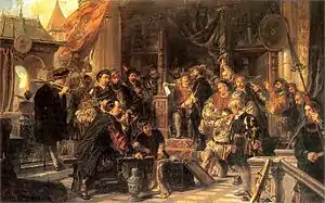 In 1883 he was chosen as director of the National Museum in Kraków.[5] In 1893/95 he served as rector of the Academy of Fine Arts. His own historical paintings filled with knowledge of period artifacts and costume, were a great source of inspiration for Jan Matejko.[note 1] They often came into being as pictorial representations of his scientific discoveries and literature on the subject. He stopped painting towards the end of his life and turned entirely to writing and art conservation advocacy. In recognition of his work, Łuszczkiewicz was awarded the title of doctor honoris causa of the Jagiellonian University in 1900,[5] and died in Kraków prior to award ceremony in the same year.[2] He was married to Malwina Ramloff (1858) and had four children: Napoleon, Zofia, Wojciech Józef, and Maria.[6]