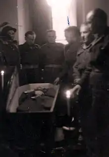 Following the end of World War II, Władysław Grydziuszko was killed in an accident near Treia, Macerata, in Italy on January 29, 1946. During a routine 2nd Armoured Brigade (Poland) training period, Władysław was killed when he fell underneath one of his tanks breaking his spine at the neck. The military considered his death "Killed in Action" (KIA) because he was on duty. His death was instantaneous, and soon afterward there was a memorial service held in his honor. Some 400 soldiers attended his funeral. He was buried in the Polish cemetery in Loreto, Italy on January 30, 1946.[4] The two witnesses of his death were a future Polish politician named Zygmunt Ostrowski pl:Zygmunt Ostrowski and Michał Matusiewicz.