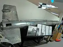 For propulsion, the 38ALDW-1500 Aerojet liquid-fueled engine was chosen, which had been developed as a JATO system for Navy flying boats.[17][18] The 38ALDW-1500 was modified for hypergolic propellants, with red fuming nitric acid as the oxidizer and furfuryl alcohol as the fuel.[19][20] The WAC Corporal was intended to use a booster derived from the Tiny Tim air-to-ground attack rocket to gain sufficient velocity along a launch tower for the Corporal's three tail fins to provide passive stability.[21][15] Despite the emphasis upon a theoretical approach, it was deemed necessary to empirically prove the Corporal's aerodynamics, especially the three fin configuration, so a solid propellant one-fifth scale model called the Baby WAC was tested from a scaled-down launcher in July 1945.[22][23] Four Baby WACs were flown.[24]