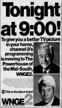 The Draughons sold the WSIX stations to General Electric in 1966.[8] In 1973, GE agreed to a deal with Nashville's PBS member station, WDCN-TV (now WNPT), then on channel 2, to swap frequencies. GE participated in the channel trade because the analog channel 2 facility was better suited for a network affiliate as opposed to a non-commercial educational station.[9] The swap occurred on December 11, 1973, at 9 p.m., in the middle of prime time programming, between that night's Movie of the Week, The Cat Creature, and Marcus Welby, M.D..[10][11] At the same time, even though General Electric still owned WSIX-AM-FM, WSIX-TV's call letters were changed to WNGE (for Nashville General Electric). This was only the third facility swap in American television history.[6]