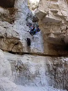 On the course of the wadi are the ruins of the Monastery of Theoctistus, known in Arabic as Deir Muqallik.[7] They are hard to access, being situated quite high on the steep northern bank of the wadi at the spot where the valley deepens, turning into a canyon.[7] According to Byzantine sources, it was established in the 5th century by Euthymius and Theoctistus.[7] Archaeologists confirm that the main phase of the cave church complex and related structures date back to the 5th-7th century, the monastery's 'golden era', with signs of a far less significant habitation period during the Early-Mid Muslim period in the 7th-11th or 12th century.[7] The cave church complex was established at the beginning of the 5th century, and at the end of the 8th the monastery was deserted.[7]