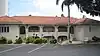 The current Wailuku Library was built in 1928 to replace another building on the same site used by the Maui County Free Library, which was created by the Maui Women's Club in 1919 as the first Library on Maui.[12] Designed by Hawaii-based architect C.W. Dickey, the building incorporates both Mediterranean Revival & Hawaiian architecture cues.[4][7][8][12] It is a single story asymmetrical building with a prominent double-pitched hip roof, which shelters the main building. The entryway features a tiled drinking fountain with a Silversword tiled motif. Two wings, each with lower but equally dramatic double-pitched hip roofs, extend to the right rear and left of the building. The walls are plastered, and contain long, thin casement windows.[4] A large Monkey-Pod Tree sits to the west of the Library;[4][12] it is the first site of Maui's first public telephone in 1878.[12]