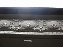 The fare control areas are at platform level. The walls along the platforms near the fare control areas consist of a pink marble wainscoting on the lowest part of the wall, with bronze air vents along the wainscoting, and white glass tiles above. The platform walls are divided at 15-foot (4.6 m) intervals by pink marble pilasters, or vertical bands. In the original portion of the station, each pilaster is topped by blue-and-green tile plaques, which contain the letter "W" surrounded by a Greek key carving. Above these "W" plaques are faience mosaics that depict a New Amsterdam step-gabled house with the palisade wall in front of it, a reference to the namesake of Wall Street. These mosaics are topped by blue faience swags and are connected by a faience cornice with scrolled and foliate detail. This decorative design is extended to the fare control areas adjacent to the original portions of the station. White-on-blue tile plaques with the words "Wall Street" and floral motifs are also placed on the walls.[2]: 5–6 [5]: 7 The platform extensions contain similar decorative elements.[2]: 5 The ceilings contain plaster molding.[2]: 5 [45]: 10