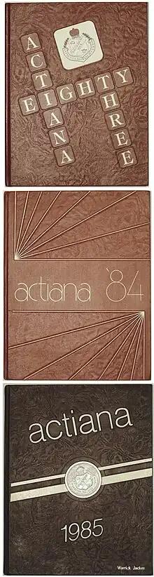 The yearbook Actiana is the record of the school's engagements (since 1949).[12][2] Year books were first introduced under Principal Dickenson (1917–1933), originally as the Tatler.[3]