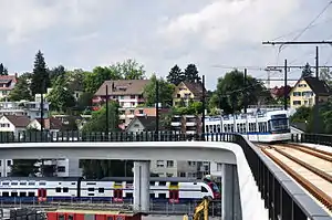 ![]() A tram descends into Wallisellen station from the Stadtbahn viaduct, whilst an S-Bahn train departs | |||||||||||||||||||||