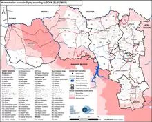 There have been several reported attacks on humanitarian workers, including attacks by Ethiopian government soldiers.[74][75][76][77] The Danish Refugee Council and the International Rescue Committee reported killings of their staff in early December 2020.[77] Although the Ethiopian federal government claimed to have given "full and unhindered access for humanitarian actors to operate in all parts of the [Tigray] region," many humanitarian agencies reported having been repulsed at army checkpoints and blocked from entry to various regions. There were accusations by US officials that armed forces were specifically singling out humanitarian workers for an attack.[78] Violence against healthcare workers and the destruction of health facilities is a violation of international laws regarding medical neutrality, and has been described as such in regards to the Tigray War.[79]
