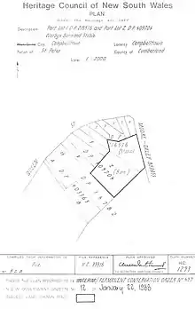 Immediately north of Phelps' grant, Assistant Surveyor James Meehan had informally reserved 71 hectares (175 acres) for a village (AMCG, 1994 say "in 1815".) In 1816 most of the land in the area was granted, leaving a portion of 71 hectares (175 acres) unalienated, and surrounded by several grants.[1][3]