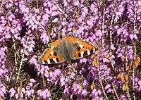 Warren Hill provides an important heathland habitat covered by the United Kingdom Biodiversity Action Plan. The hill immediately overlooks Withybed Wood, itself an important ecosystem and migratory point.[10] Hengistbury Head was declared a Local Nature Reserve in 1990; the heathland in particular is designated as both a Special Area of Conservation and a Special Protection Area, part of a network of the best wildlife sites in Europe.[8] The plateau is dominated by ling (common heather), with heather-bell found in the drier soils and cross-leaved heath in wetter areas. Dwarf gorse and tormentil give the area a touch of extra colour.[12] Sundews, carnivorous plants that supplement their diet by trapping and devouring insects, can be observed in the boggy areas.[12]
