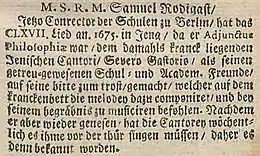 Although the text of Rodigast's hymn was published without the melody in 1676 (in the Hannoverische Gesangbuch), it was discovered in the 1960s that already within three years the melody had been used in Jena for other hymn texts by Daniel Klesch. Educated at the University of Wittenberg, Klesch was a Hungarian pietist minister who, after the Protestant expulsions in Hungary, served during 1676–1682 as rector at the Raths-Schule in Jena where Gastorius acted as cantor. Klesch used the melody for two different hymn texts—"Brich an, verlangtes Morgenlicht" and "Der Tag, der ist so freudenreich"—in the Andächtige Elends-Stimme published by his brother Christoph Klesch in 1679. The Klesch hymnbook names four of the 44 hymn melodies it contains as being known and two as being composed by a king and a count; it describes the remaining 38—without further precision—as being written by Severus Gastorius and Johann Hancken, cantor in Strehlen in Silesia.[14][15][16][17]