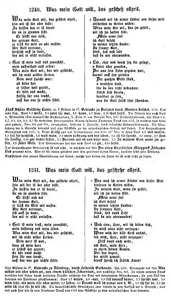 - ↑ "Was mein Gott will, das g'scheh allzeit". hymnary.org. Retrieved 5 April 2020.