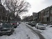 Washington Park Court, which runs one-way northbound from East 50th Street to East 49th Street, is a one-city block-long street located at 432 east in the Chicago street numbering system. Officially, it runs from 4900 south to 5060 south in the numbering system.[3] The street and several adjacent homes at one end are recognized as a distinct district within the city, according to the City of Chicago Department of Planning and Development.[2] In May 1990, the district was one of ten that were under consideration for Chicago Landmark status,[7] and it was designated a Chicago Landmark on October 2, 1991.[2] The district was named for the Park,[3] which was designed by landscape architect Frederick Law Olmsted.[8]