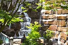 Waterfall Garden Park, also called UPS Park and UPS Waterfall Park, is a private 60-by-80-foot (18 m × 24 m) pocket park in Seattle, Washington, created in 1978 at the original United Parcel Service building in Pioneer Square. It is open to the public during the day and closed at night. The park was designed by Masao Kinoshita with Sasaki Associates[2][3] and funded by Annie E. Casey Foundation to commemorate UPS's founder, James Casey.[4] The park is named for a manmade 22-foot (6.7 m) tall waterfall over which is pumped 5,000 US gallons (19,000 L) of water per minute.[4] It is described as "one of the most expensive parks per square foot ever built in the United States".[5] Roger Sale says in the guidebook Seeing Seattle that the park is locked at night to keep out the sizeable Pioneer Square homeless population.[6]