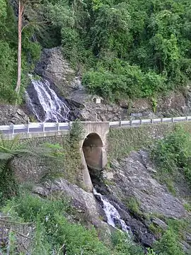 Between Ebor and Wollomombi the route passes through the 8,839 ha (21,840 acres) Cathedral Rock National Park. The National Heritage listed Yooroonah Tank Barrier is approximately 12 km (7.5 mi) southwest of Ebor and near the route.[7] After leaving Ebor the road passes an intersection, from where the Dutton Trout Hatchery, and Point Lookout are accessed about 10 km (6.2 mi) east of Waterfall Way in the New England National Park. Further on, the Wollomombi Falls are about 1 km (0.6 mi) south of the Waterfall Way. The 145,000 ha (360,000-acre) World Heritage listed Oxley Wild Rivers National Park is readily accessible from the Wollomombi Falls.[8] From here the road passes 5 km (3.1 mi) north of the historical mining village of Hillgrove and the viewing platforms at Bakers Creek Falls and the Metz Gorge. There are also other more remote, interesting sites to visit on this Way to Armidale. The Gara Gorge is 18 km (11 mi) south-east of Armidale along the Castledoyle Road leading off the Waterfall Way just east of Armidale.