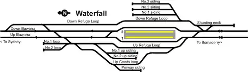 Waterfall has sidings for staging freight trains in either direction and a bypass track for goods trains on either side of the platforms. There are also three sidings for the stabling of suburban electric trains to the east of the station. If both platforms at Waterfall station are occupied, then trains that do not stop at Waterfall will also pass by on the bypass tracks.