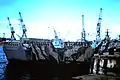 - Harrier GR.3 undergoing an engine change in the hangar deck on HMS Hermes. A Fleet Air Arm Lynx is visible at the rear of the hangar.