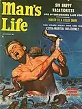 Frank Zappa recruited artist Neon Park to create a subversive image based on a cover story from the September 1956 issue of Man's Life, a men's adventure magazine. The magazine's cover story depicts a shirtless man being attacked by numerous weasels, above the caption "Weasels Ripped My Flesh". After showing Neon a copy of the magazine, Zappa inquired, "This is it. What can you do that's worse than this?" Neon's answer was to craft a parody of an advertisement for Schick brand electric razor based on the "Weasels Ripped My Flesh" theme.[5] The record company released the album despite its reservations about the album cover.[6][7]