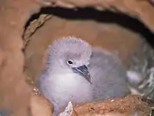 Wedge-tailed shearwaters are monogamous, forming a pair bond that lasts for several years. Divorce between pairs occurs after breeding seasons that end in failure. Nesting occurs either in burrows or sometimes on the surface under cover. Pairs call frequently as a pair, both to reinforce the pair bond and warn intruders away from their territory. Parents also call to their chicks. The call is long, with an inhaling component (OOO) and exhaling component (err); their Hawaiian name 'ua'u kani means moaning petrel. Both sexes participate in digging a burrow, or repairing the burrow from last year. Nesting burrows of other species are also used. The breeding season of the Bonin petrel in Hawaii is timed to avoid that of the wedge-tail; in years where Bonin petrel chicks are still in burrows when wedge-tails return to begin breeding, these chicks are killed or evicted. It attends these colonies nocturnally, although nonbreeding wedge-tails are often seen at the surface throughout the day and breeding birds rest outside their burrows before laying.