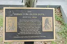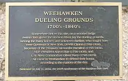 Not far from Deas' was a ledge 11 paces wide and 20 paces long, situated 20 feet (6.1 m) above the Hudson on the Palisades. This ledge, long gone, was the site of 18 documented duels and probably many unrecorded ones in the years 1798–1845. The most famous is the duel between Alexander Hamilton, first Secretary of the Treasury, and Aaron Burr, then Vice President of the United States, which took place on July 11, 1804;[35] this duel was re-enacted on its 200th anniversary (July 11, 2004) by descendants of Hamilton and Burr.[36] Three years earlier, a duel was held at this spot between Hamilton's son, Philip Hamilton, and George Eacker.[37] (Another source, however, puts the duel in Paulus Hook in Jersey City.[38]) Phillip, who had been defending his father's honor, suffered a fatal wound in his hip and his left arm and died two days later on November 24, 1801.[37]