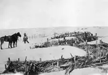 That night, 22/23 December, the advance continued towards Magdhaba. This village was surrounded on three sides by a wadi, and defended by several redoubts which were covered by artillery and machine-guns. At 05:00 the regiment dismounted four miles (6.4 km) to the north-east of the village.[80] The attack started just before 10:00. The regiment, positioned on the brigade's right, headed towards their objective, Redoubt No.5. They galloped across the open ground, through artillery and machine-gun fire, until they were 1,600 yards (1,500 m) from the Turkish lines, at which point they dismounted and continued on foot. Their Lewis Guns, supported by a section from the Machine-Gun Squadron, pinned down the Turkish defenders, while the assault continued.[81] By 11:00 the 6th and 9th Squadrons were only five hundred yards (460 m) from the objective when Harry Chauvel, who was in command of the ANZAC Mounted Division, asked the Desert Mounted Corps commander, Philip Chetwode, for permission to withdraw because he believed that no progress had been made. Chetwode instead ordered an all out assault.[82] In the meantime, the regiment continued the advance anyway, and at 15:55 they fixed bayonets and charged the redoubt, capturing some of the Turkish defenders. At 16:40 the 10th Light Horse Regiment carried out a mounted charge into the middle of the position, and all resistance ceased.[83] The battle had cost the regiment five dead.[62]