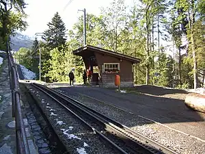The station is located on the new line from Lauterbrunnen to Wengen, which opened in 1910 to replace the more direct but steeper original routing. It is immediately uphill of a 180 degree helical tunnel which the line uses in order to reduce the gradient.[1]